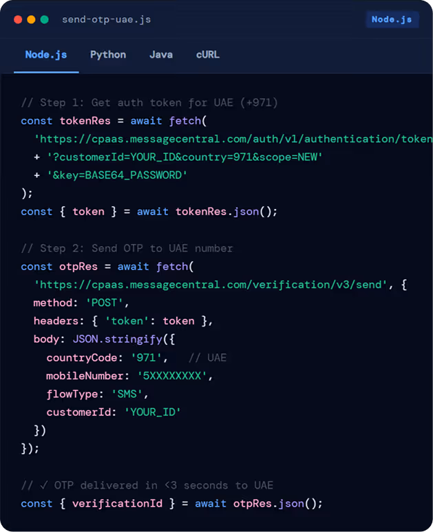 Message Central provides SDKs for Python, Node.js, Java, PHP, and .NET. REST API documentation includes copy-ready code examples in all major languages. A Postman collection with pre-configured UAE endpoints is also available for rapid testing before production integration.